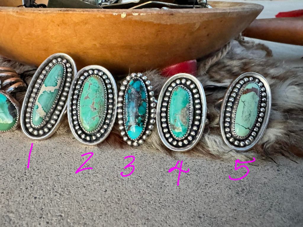 Some of my favorite hand-picked chunks of turquoise adorned with a simple shadowbox setting. Sterling silver on a thick double band.